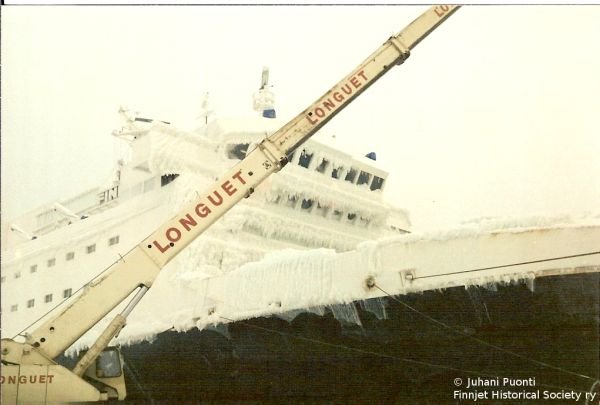 Images taken after the rare (unique?) aborted Travemünde-Helsinki run in January 1987. GTS Finnjet had to return to Travemünde for de-icing. This heavy tonnage on top of the superstructure created a serious risk of keeling over. Accusations were issued.